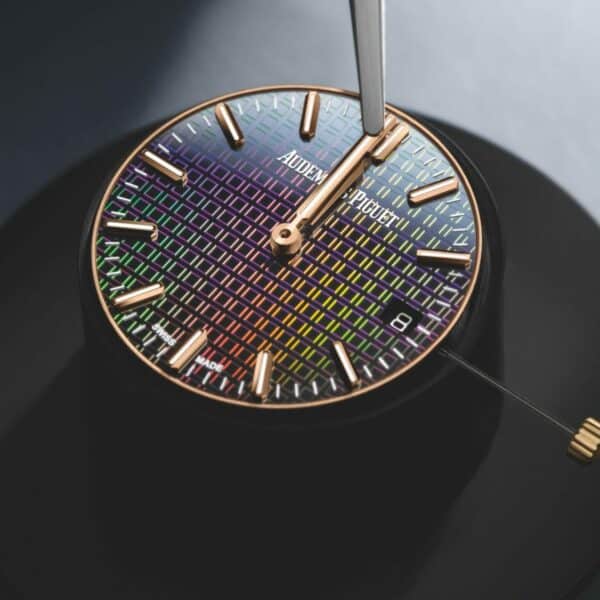 The Audemars Piguet Royal Oak Carolina Bucci watch, which has been created to celebrate the icon’s 50th anniversary, offers a dial that at first appears black but on closer inspection is a very special multi-coloured mirror effect – a tribute to the iconic Tapisserie design.