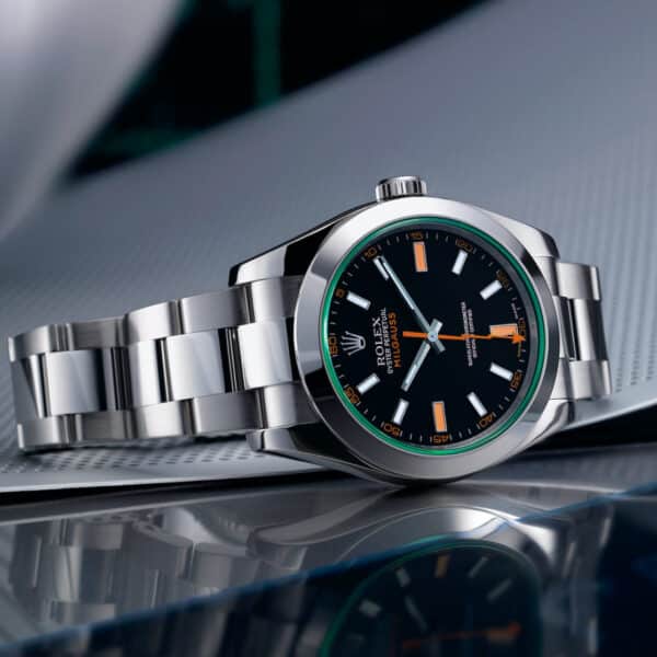 Another key feature of the Rolex Milgauss that distinguishes it from other models in the brand’s catalog is the sapphire. It’s scratch-resistant and unique to the Milgauss. Like the lightning bolt hand, the original model didn’t come equipped with this feature but it appeared in the new version of the Milgauss.