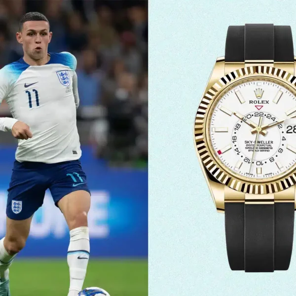 England’s rising star looking to cement his place in the best team in Europe this season, has been spotted wearing an 18ct yellow gold Rolex Sky Dweller, 326238.