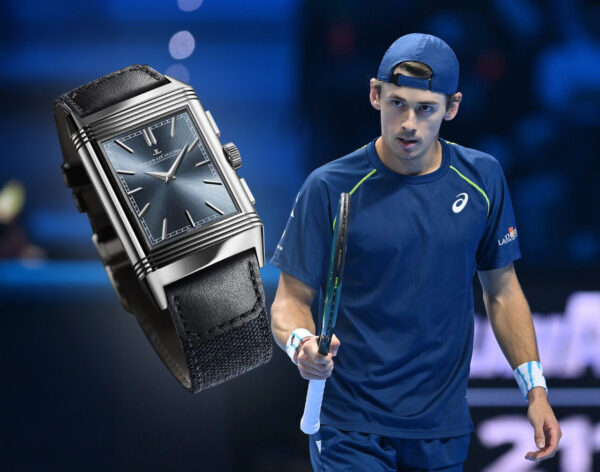 On de Minaur’s watch, the reverse side reveals a skeletonised chronograph dial, showcasing the inner workings of Jaeger‑LeCoultre’s manual‑winding Calibre 860 movement.