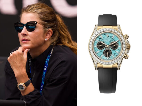 A former tennis star herself, Mirka Federer watched husband Roger in an exhibition match at the Rod Laver arena and the price of the 2025-release watch she wore was eye-watering, coming in at £550,000. It was a Rolex Daytona watch with a diamond-encrusted 18 ct yellow gold bezel.