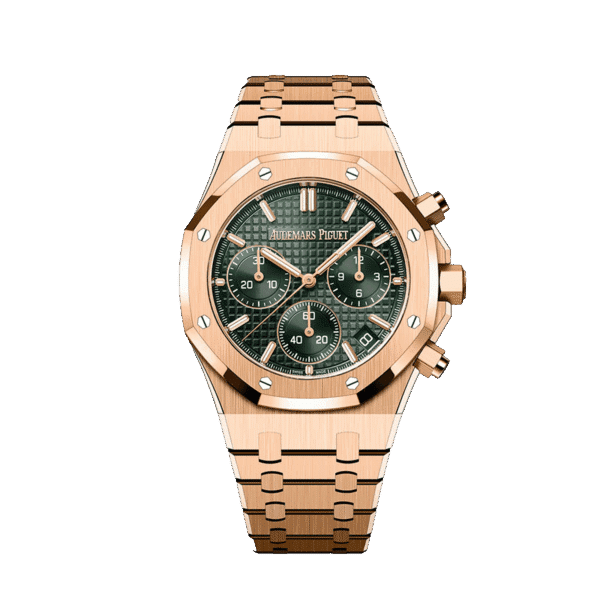 Celebrating the 50th anniversary of the Royal Oak, this model features a khaki green Grande Tapisserie dial set in pink gold. It’s a refined take on the green dial trend, combining luxury with subtlety.