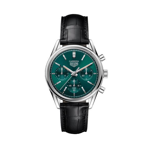 TAG’s racing-inspired chronograph really pops with its vibrant green sunburst dial, proving just how well the color works with sportier styles.