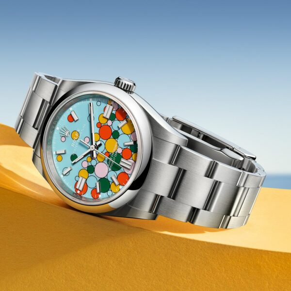 But the new Oyster Perpetual range in 31mm, 36mm and 41mm are adorned with coloured pink, turquoise, yellow, red and green bubbles on a turquoise dial.