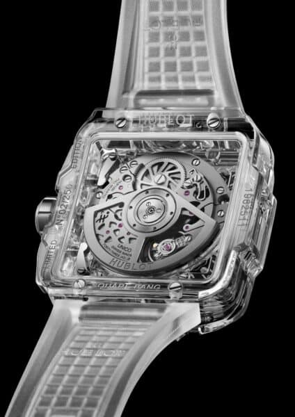 The clear sapphire case is the most noteworthy feature of the new Hublot Square Bang Unico Sapphire and is slightly smaller than the 2022 models, at 41mm. All the case components are made from transparent sapphire but held together with titanium screws.