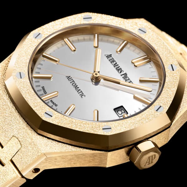 Designer Caroline Bucci collaborated with AP to create the Royal Oak Frosted Gold.She transformed the bracelet by beating the metal by hand with a diamond-tipped tool to create a sparkly finish. It was also a big hit with men and a testament to great design, still as relevant as when Genta first created it.