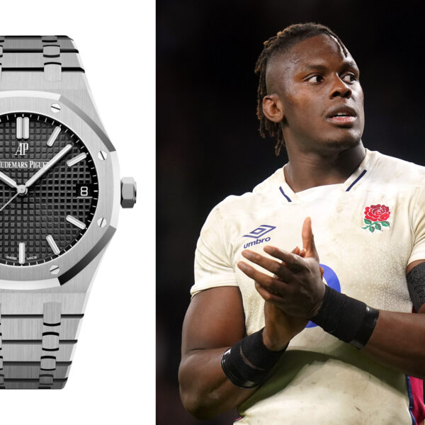 Missing the tournament to play in the Olympic Sevens, France scrum half and World Player of the Year, Antoine DuPont, has been spotted in a smart Audemars Piguet Royal Oak with a blue dial ‘Grande Tapisserie’ pattern and white gold applied hour markers.