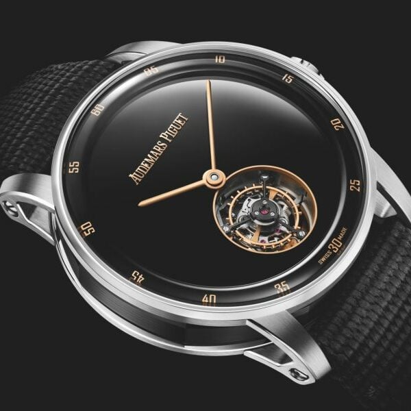 Offered on a black textured rubber-coated strap, this one looks smart and is finished off nicely with an 18k pink gold AP folding clasp.