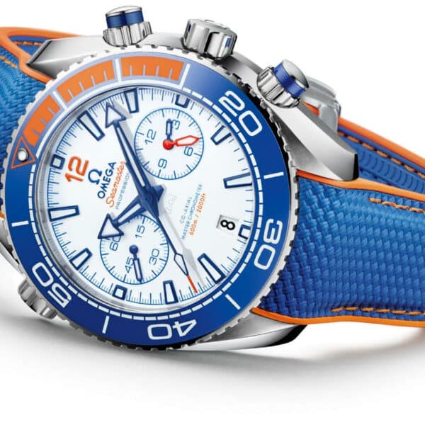 The funky blue and orange Omega Planet Ocean ‘Michael Phelps’ edition is a great choice for swimmers and divers alike, with a fab 600m water resistance.The white ceramic dial features blued applied indexes and an Arabic numeral 12 in orange. The watch boasts an integrated blue structured rubber strap with blue-orange rubber lining and orange stitching.