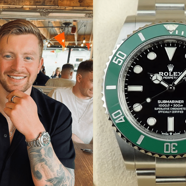 Adam wears a current version of the Rolex Submariner, reference 126610LV, with a green ceramic bezel and black dial. Its rotatable bezel is a key functionality of the watch. Its 60-minute graduations allow a diver to accurately and safely monitor diving time and decompression stops.