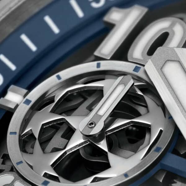 Crucial moments on the pitch are timed with the bead-blasted blue ceramic chronograph.The sporty number, perfect for a casual soccer match or dinner out, features contrasting matte black and silver pushers, while its skeletonised chronograph dial design showcases the inner workings of the complex movement.