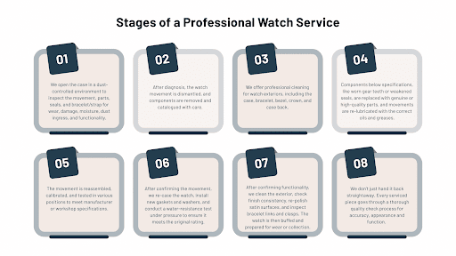 So, what does a watch service include? In short, inspection, disassembly, cleaning, lubrication, parts replacement, calibration, resealing, final finishing, and quality control.