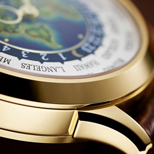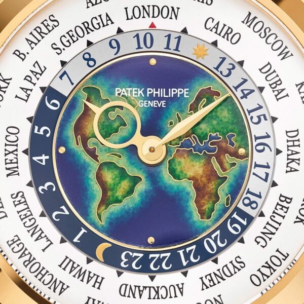 And we know he likes fancy – so he will love the dial centre which features a hand-crafted cloisonné enamel world map that is both intricate and visually striking. It showcases continents and oceans with vibrant, artistic detailing, emphasising Patek Philippe’s enamel techniques.